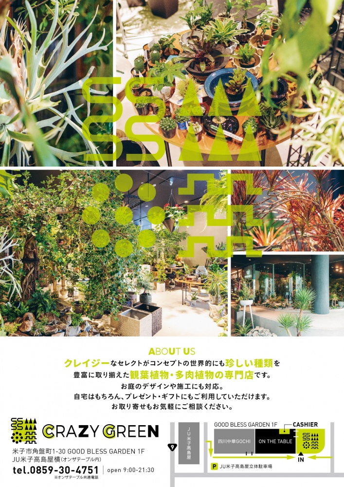 米子市のJU米子高島屋様のお隣りにあるカフェレストラン「オンザテーブル 」様の入口スペースに新しくオープンした「CRAZY GREEN(クレイジーグリーン)」様。