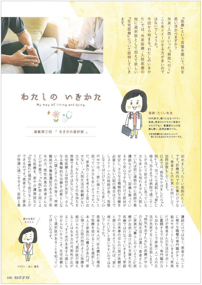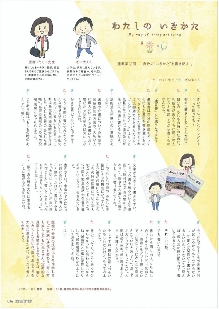 大切な人のため、自分のためにもしもの時のために「在宅医療」という選択肢を知ってほしいという気持ちから始まった連載【わたしの いきかた】。(公社)鳥取県西部医師会「在宅医療推進委員会」の先生方の監修のもと2017年12月発刊のカミナリより開始しました。