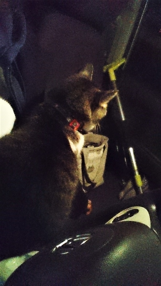 ※車内、運転席にて、膝の上に乗って暖をとる猫