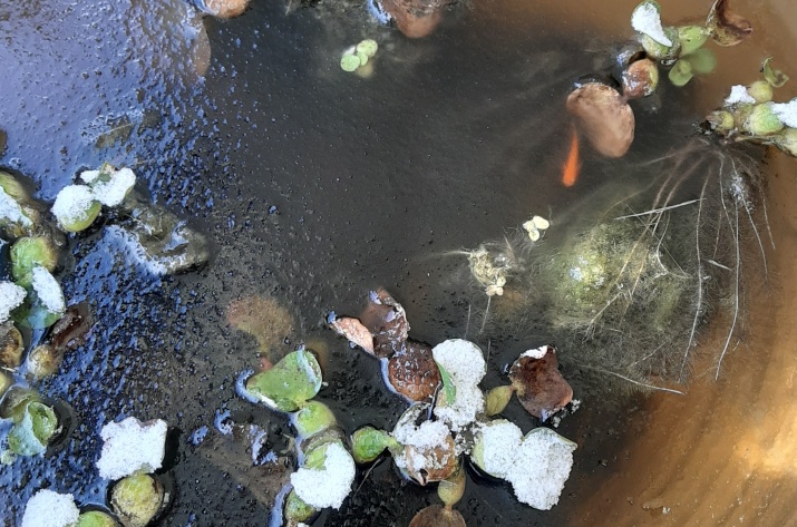 5年くらいメダカを飼っていますが、水面が凍るのは初めてです。それだけ今回の寒波は凄まじかったと言うことですね。(メダカ〜無事に冬越ししてね…!)