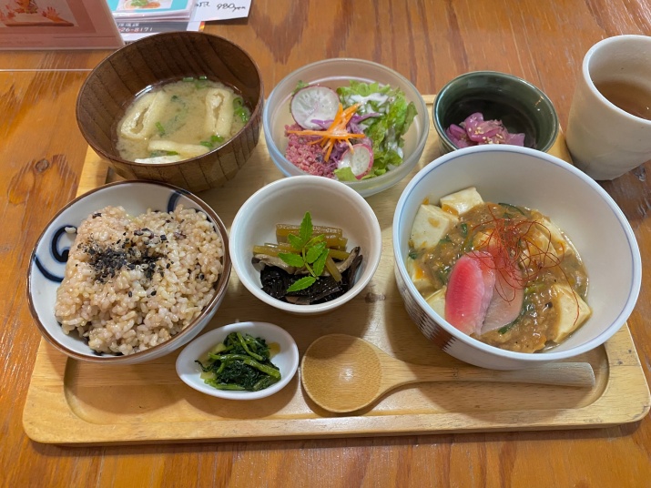 玄米ご飯がもちもちしていて、噛みごたえ抜群です。主菜、副菜も優しいお味でほっこりする定食でした。この日のサラダはスーパーフードのキヌアを使用されていて、初めて食べましたがとても美味しかったです!