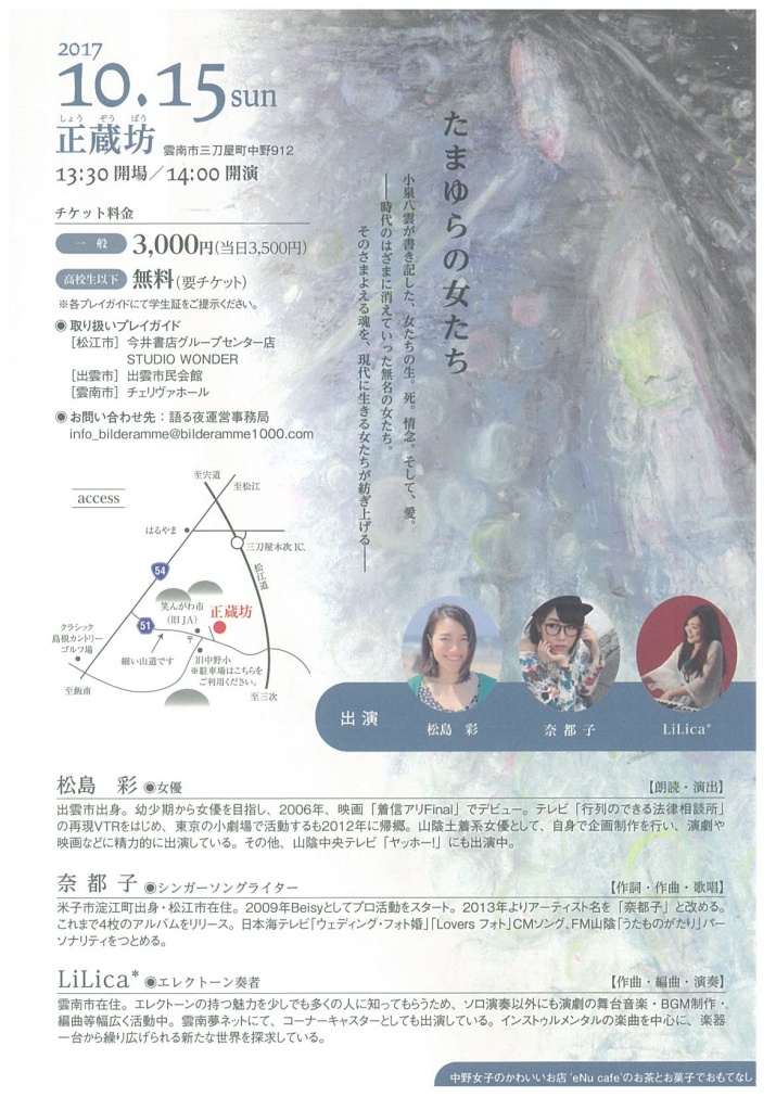 今週末開催!!!松島彩さん×奈都子さん×LiLica*さん = 語る夜 【たまゆらの女たち】小泉八雲作品集