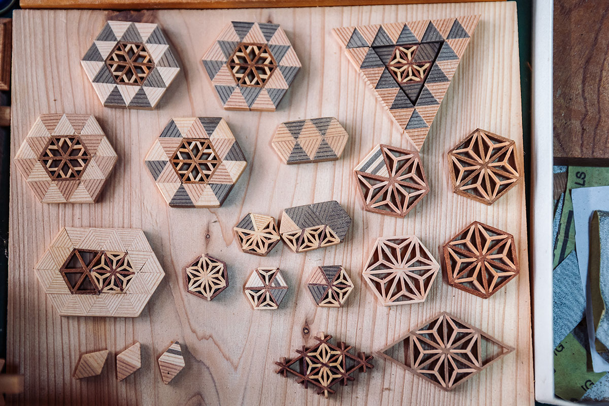 釘などを使わず小さな木片を組み合わせて幾何学的な模様を生み出す組子細工は