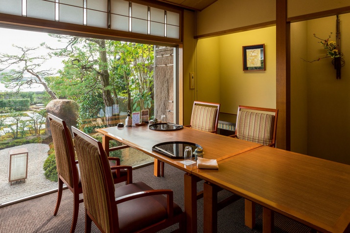 見どころは素晴らしい日本庭園。席から宍道湖と美しい湖畔庭園を眺めながめながら、ゆったりと皆美の伝統の味を楽しむことができます。特別なひとときになること間違いないでしょう。
