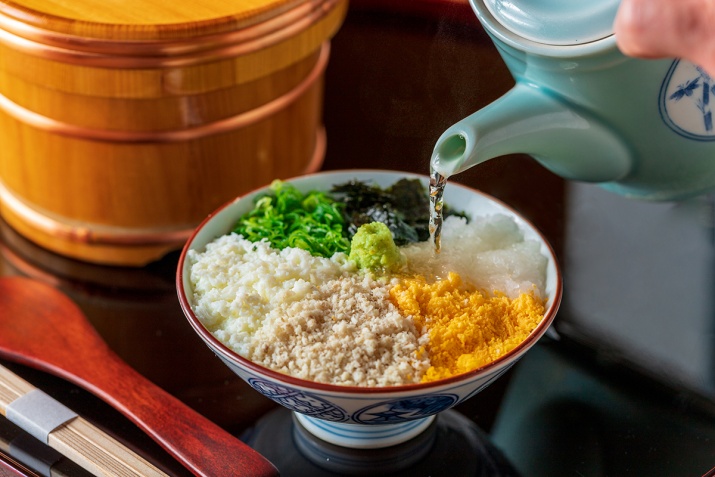 そぼろにした鯛の身を、ゆでた卵の白身のみじん切りや裏ごしした黄身と一緒にご飯の上にのせ、ワサビ、大根おろし、ねぎ、海苔を添え、秘伝のだし汁をかけていただきます。