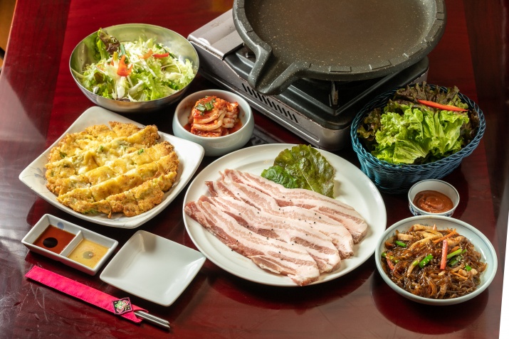 今回、サムギョプサルセットとアボカドチヂミを取材しております!写真はサムギョプサルセット2人前ですが、ボリューム満点で無添加にこだわっておられます。