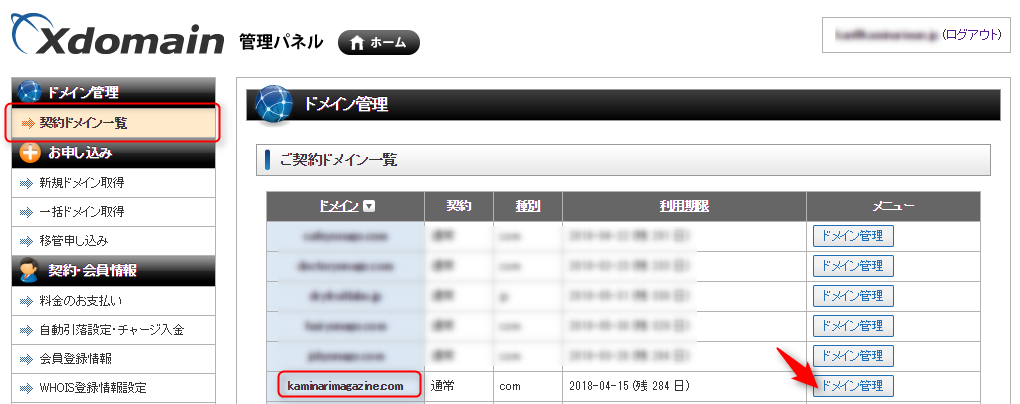管理メニューの左上にある【契約ドメイン一覧】を開くと、取得済みのドメイン名の一覧が表示されます。そこから目的のドメイン名にある【ドメイン管理】ボタンを押してください。