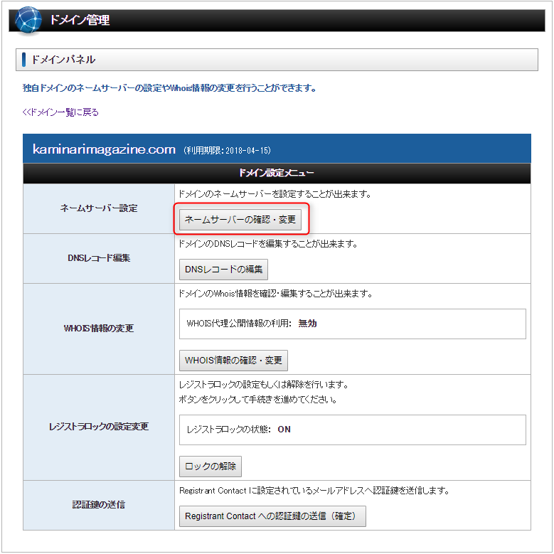 今回はDNSサーバー(=ネームサーバー)の設定を変更しますので【ネームサーバーの確認・変更】から次の画面に移行してください。