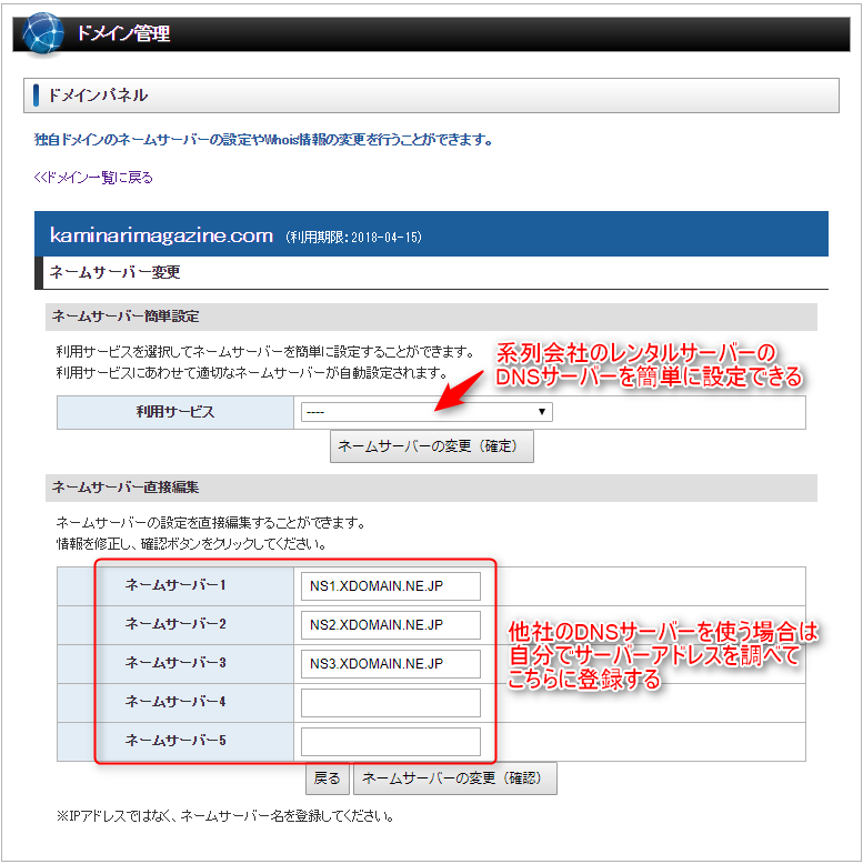 別系列の会社を使用する場合、ネームサーバーにどのような値を指定するかは自分で調べておく必要があります。