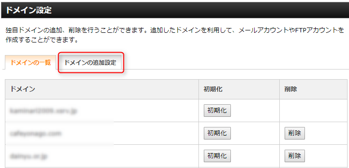 設定済みのドメイン一覧が表示されます。ここで【ドメインの追加設定】というタブを選びます。