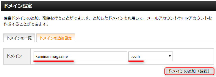 ここでこのレンタルサーバーに登録するドメイン名を入力して、【ドメインの追加(確認)】ボタンを押しましょう。