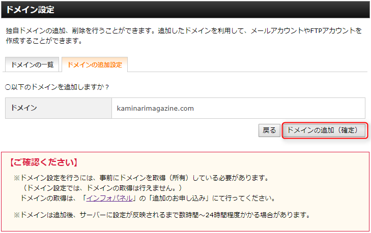 【ドメインの追加(確定)】ボタンで登録が完了します。