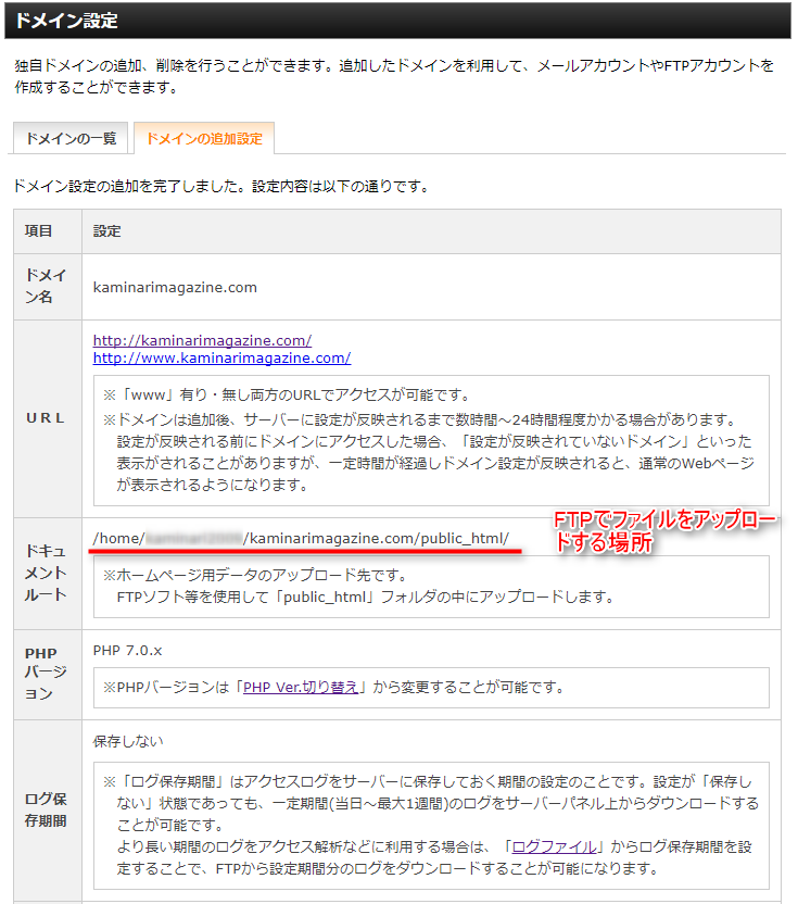 設定完了画面です。FTPのアップロード先も記載されていますので、きちんと把握しておきましょう。