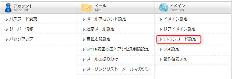 エックスサーバーのDNSサーバーを使うよう設定しましたので、以後はエックスサーバーの管理画面からDNSの値(レコード)を設定します。【DNSレコードの設定】を使います。