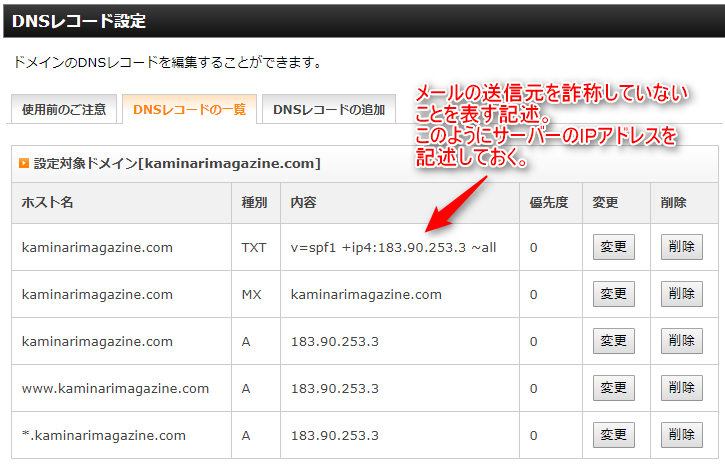 ここでは詳細は省略しますが、下記のように 種別がTXTのレコードに、v=spf1~~ といった値を記述しておきます。