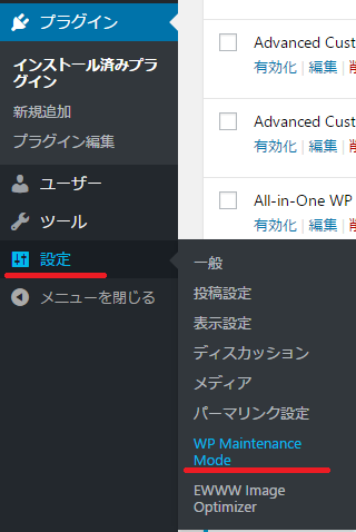 まずこのプラグインをインストールすると、管理画面のメニュー「設定」に 「WP Maintenance Mode」があらわれます。こちらを開きましょう。