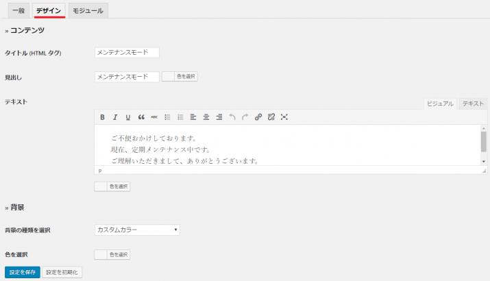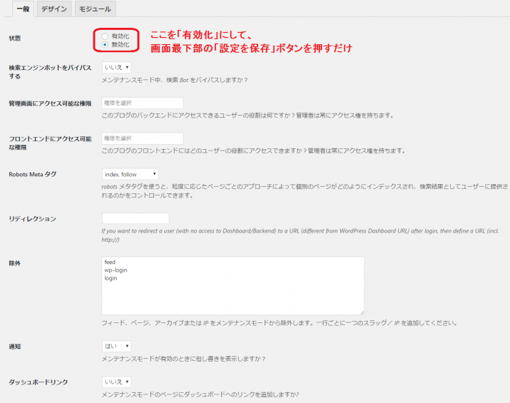 設定画面が出てきます。こちらで「状態」を「有効化」にし、画面最下部にある「設定を保存」ボタンを押すだけで、冒頭のようなメンテナンスモードに簡単に設定することが可能です。