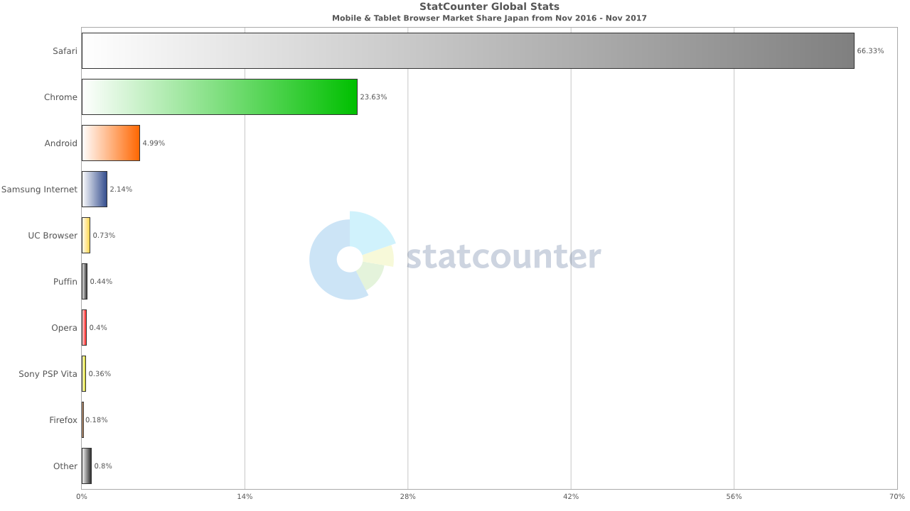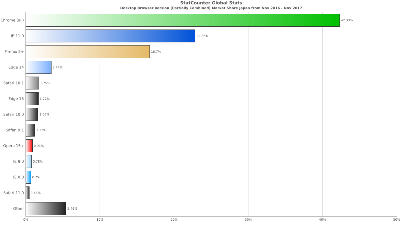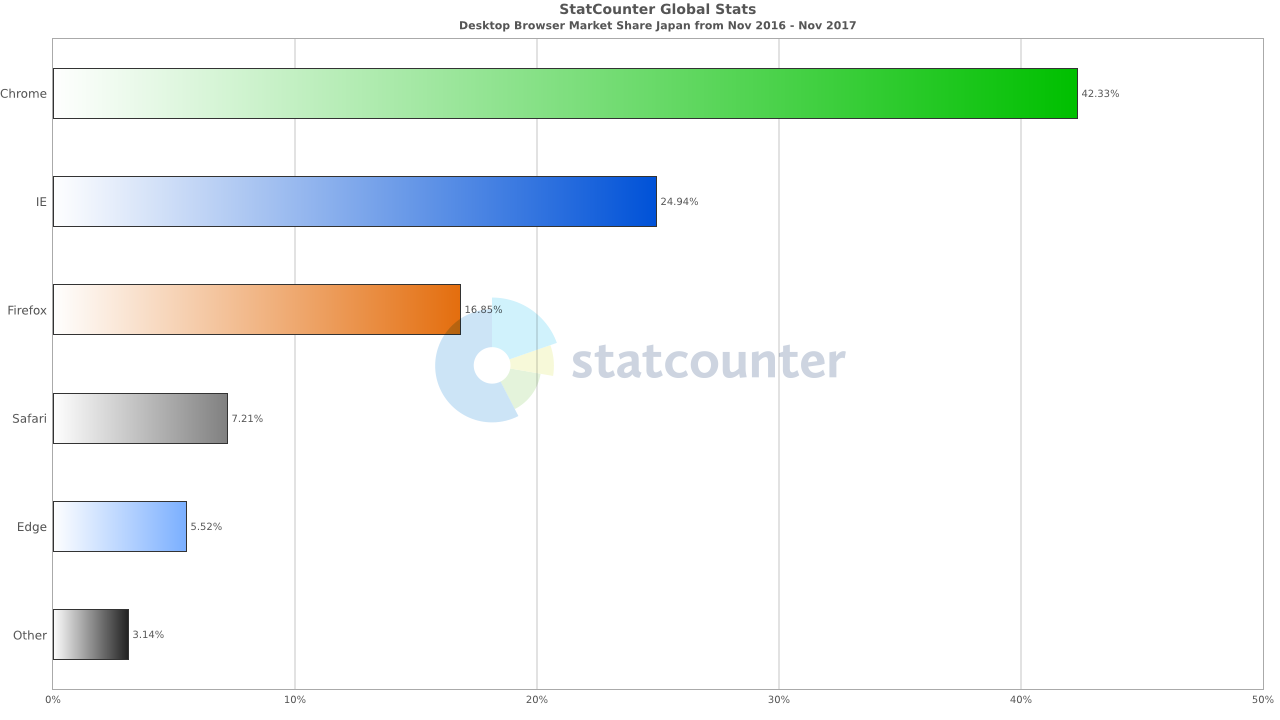 2017年も終わりということで過去一年間のブラウザの国内使用率を調べてみました。