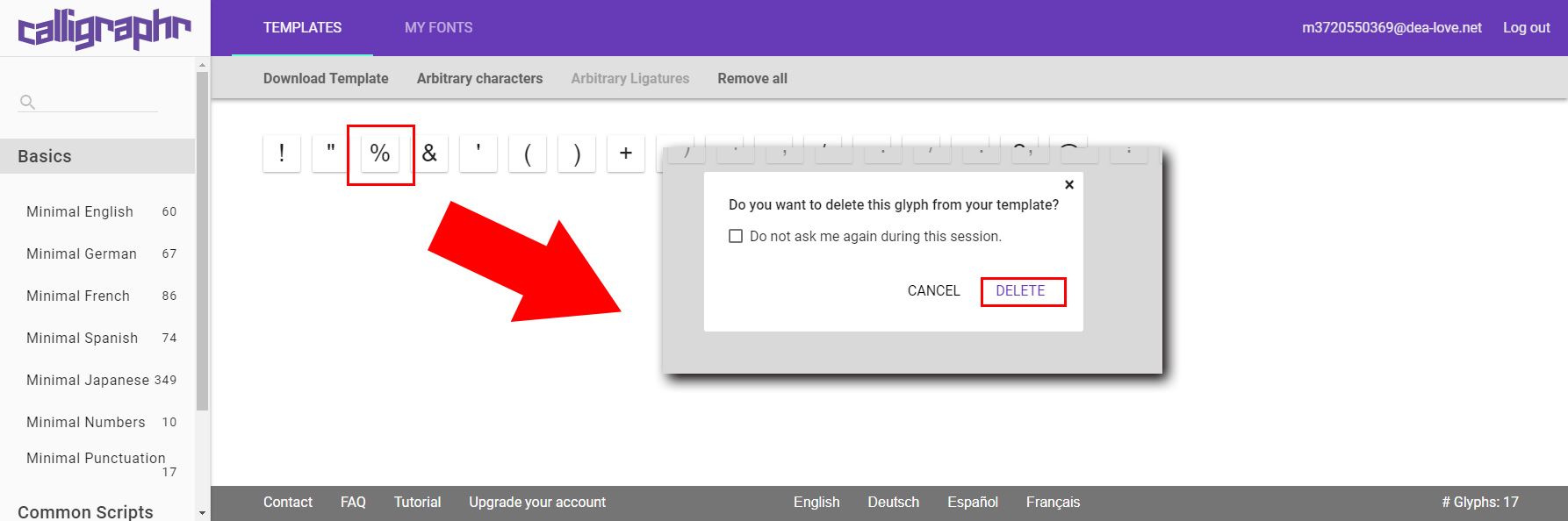 文字をクリックして”DELETE”で削除できるのでいらない文字は削除しておきましょう。