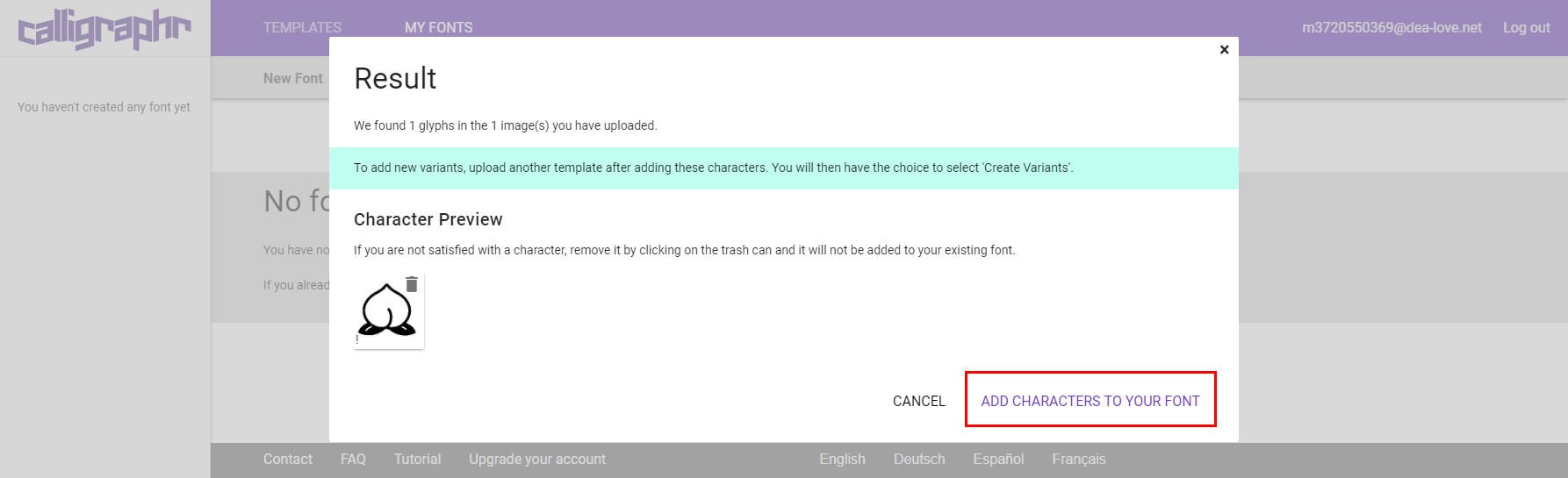 アップロードに成功したらこんな画面になるので迷わず”ADD CHARACTERS TO YOUR FONT”をクリックするべし。