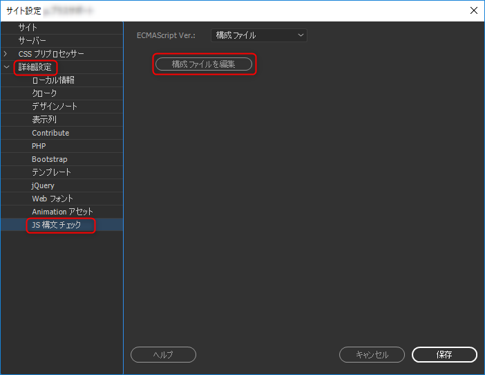 詳細設定 → JS構文チェック → 構成ファイルを編集 の順に開きます。