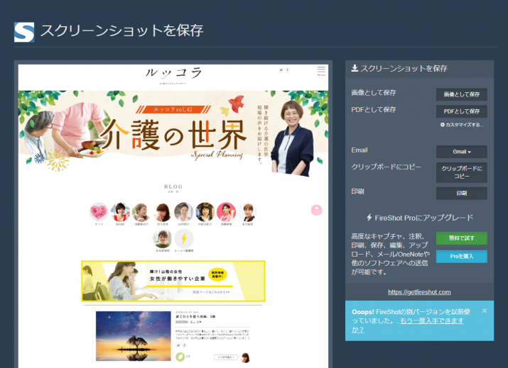 ウェブページのスクリーンショットを取得したい場合、ブラウザの拡張機能を使うのが一般的です。私は Google Chrome の Fireshot を使用しています。