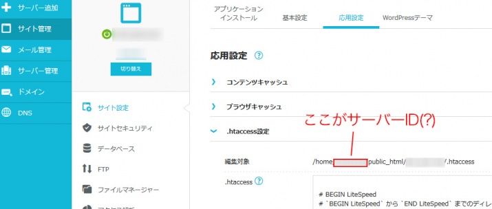 「サイト管理」→「適当なドメインを選択」→「応用設定」→「.htaccess設定」→「編集対象」のurlから判別。