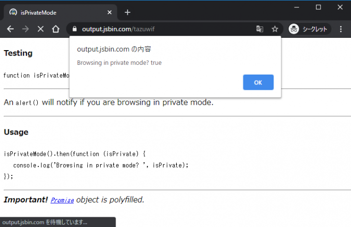 ダイアログボックスで開かれ、シークレットモードなら true , そうでないなら false と表示されます。