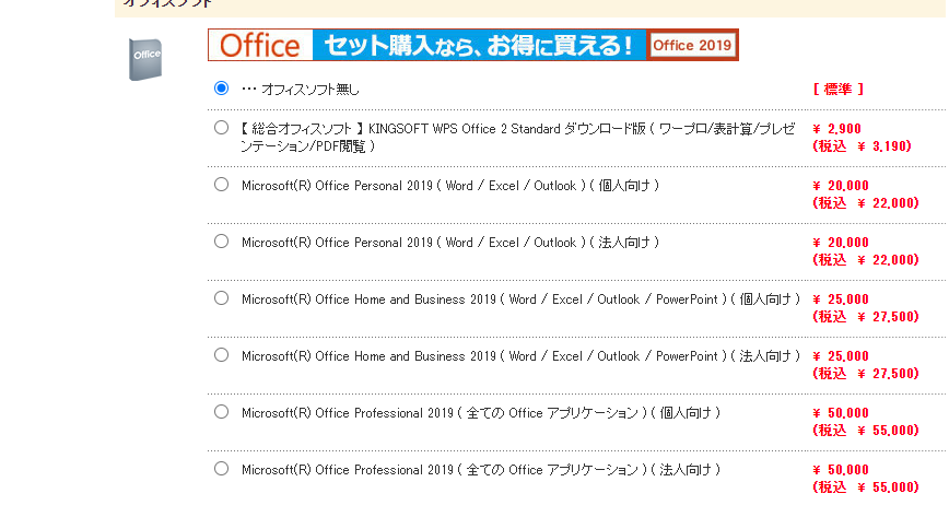 参考までに「マウスコンピューター」で確認するとPowerPointの有無で価格差が5,000円ありました。