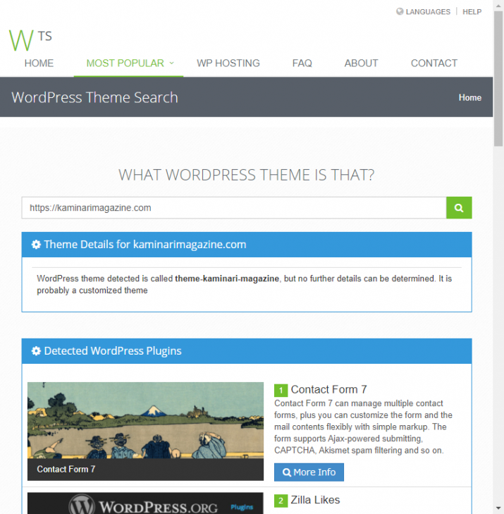 例えば当サイトを調べると、プラグインの Contact Form 7 や Zilla Likes を使用していることがわかります。