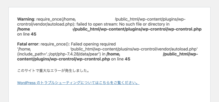 Fatal error: require_once(): Failed opening required ‘…/wp-content/plugins/wp-crontrol/vendor/autoload.php’ (include_path=’.:/opt/php-7.4.28/data/pear’) in …/wp-content/plugins/wp-crontrol/wp-crontrol.php on line 45
