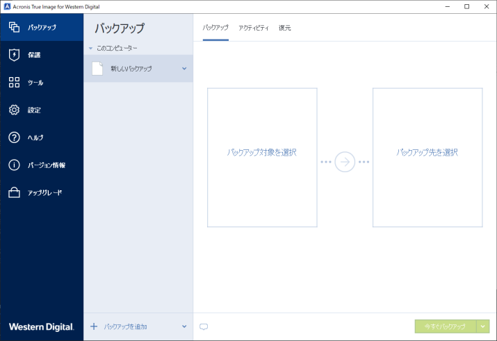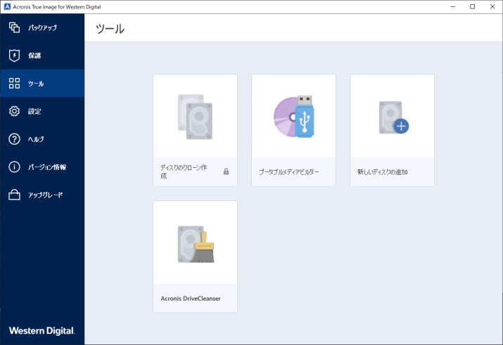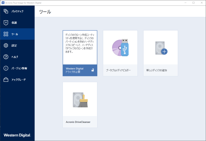 インストールした「Acronis True Image for Western Digital」を起動するとこんな画面になります。