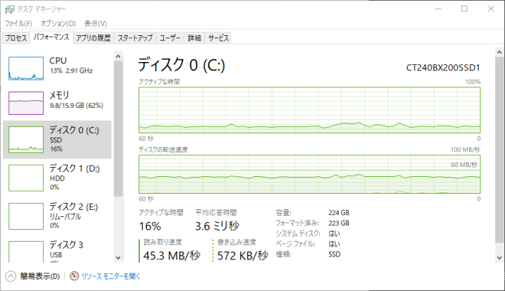 更に画像では見切れていますがUSB接続しているSSDの使用率がほぼずっと0%のままです。